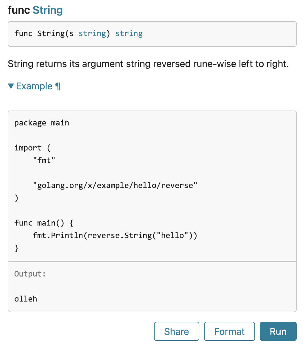 The reverse package is part of the Go example repository. Here’s an example that demonstrates its String function:
