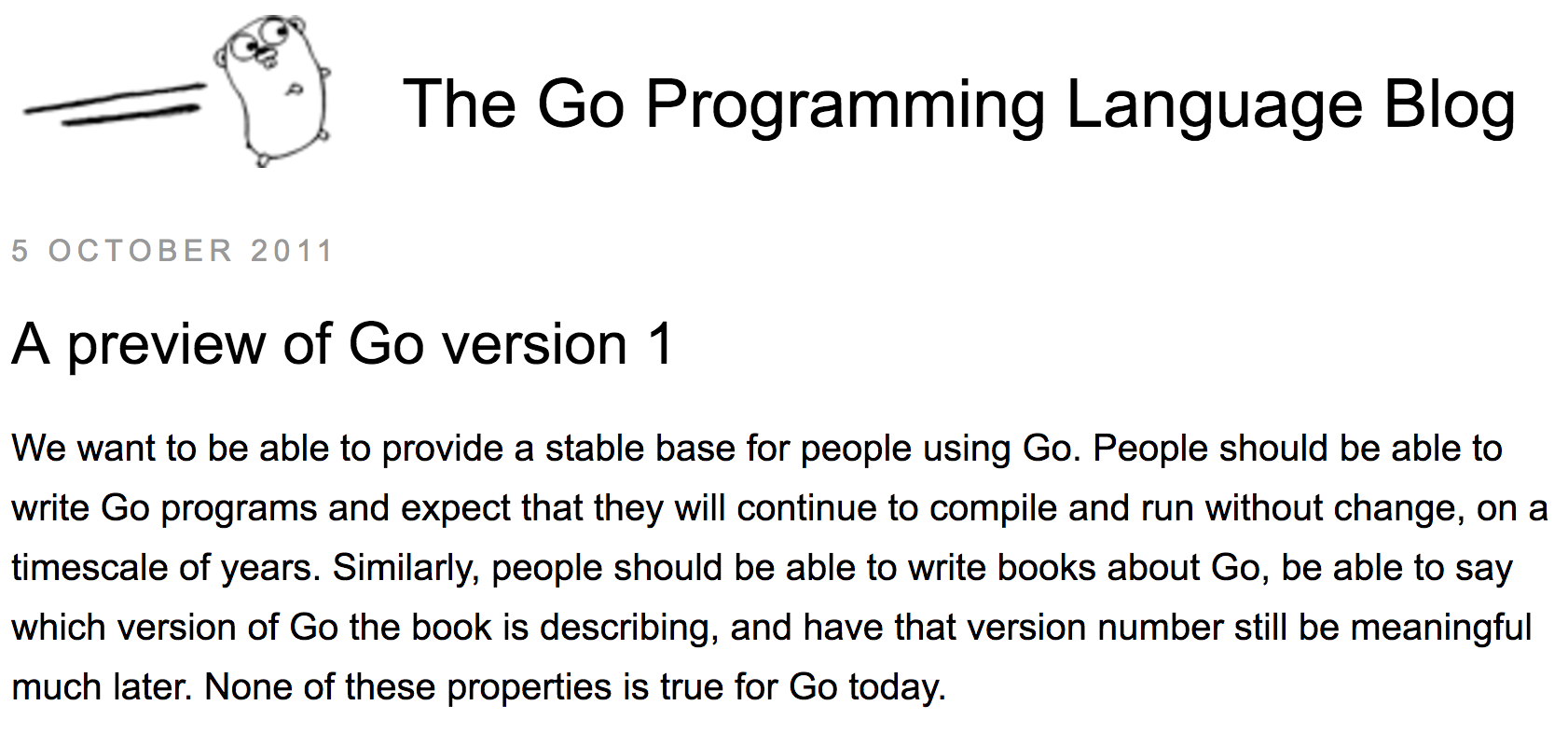 The release of Go 1 marked the culmination of nearly five years of creative, frenetic effort that took us from a name and a list of ideas to a stable, production language. It also marked an explicit shift from change and churn to stability.