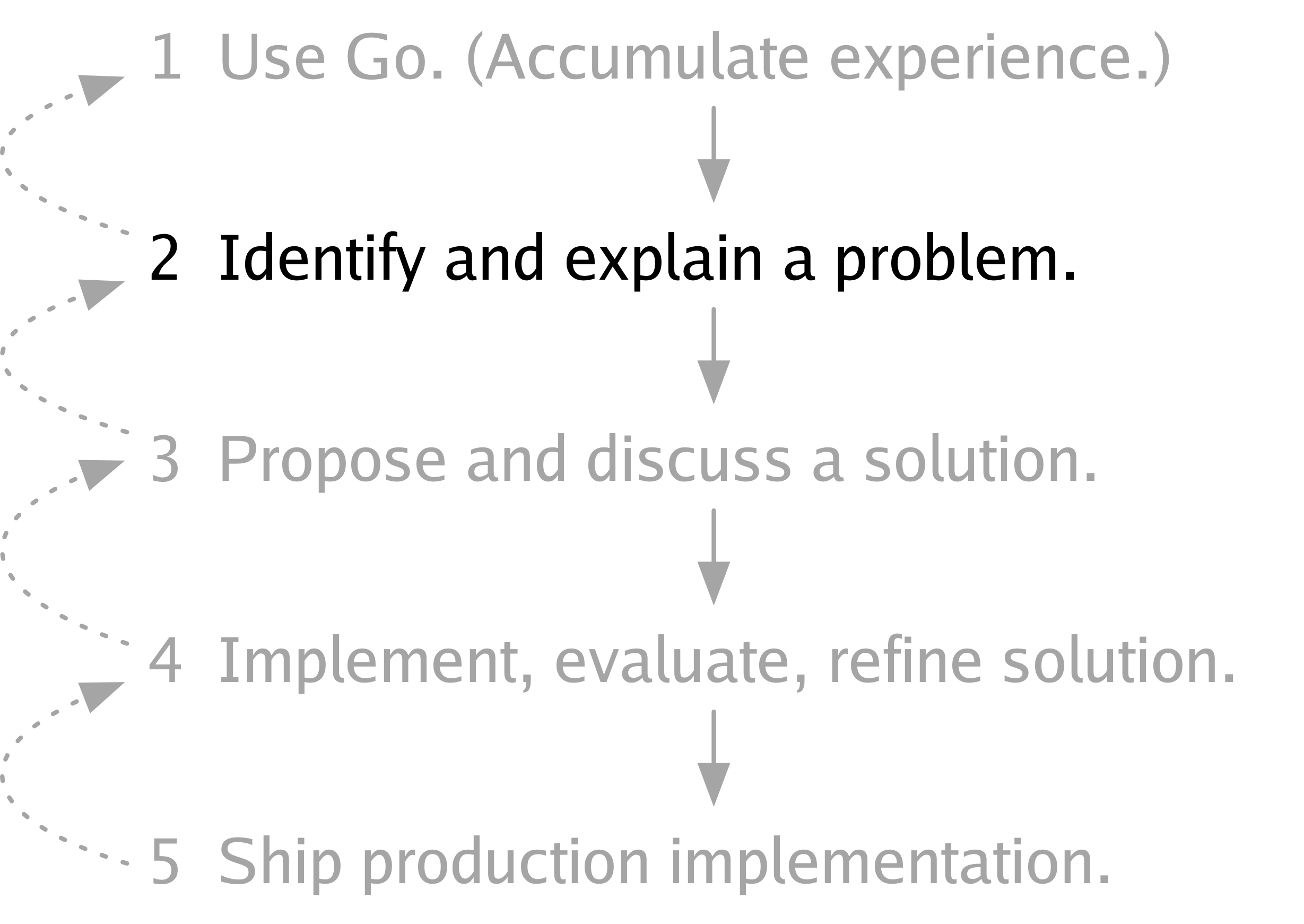 Step 2 is to identify a problem with Go that might need solving and to articulate it, to explain it to others, to write it down.