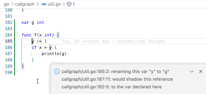 - Candidate declarations are sought only in the current file, and only above the current point. Symbols declared beneath the current point, or in other files in the package, are not considered; see https://go.dev/issue/68224.