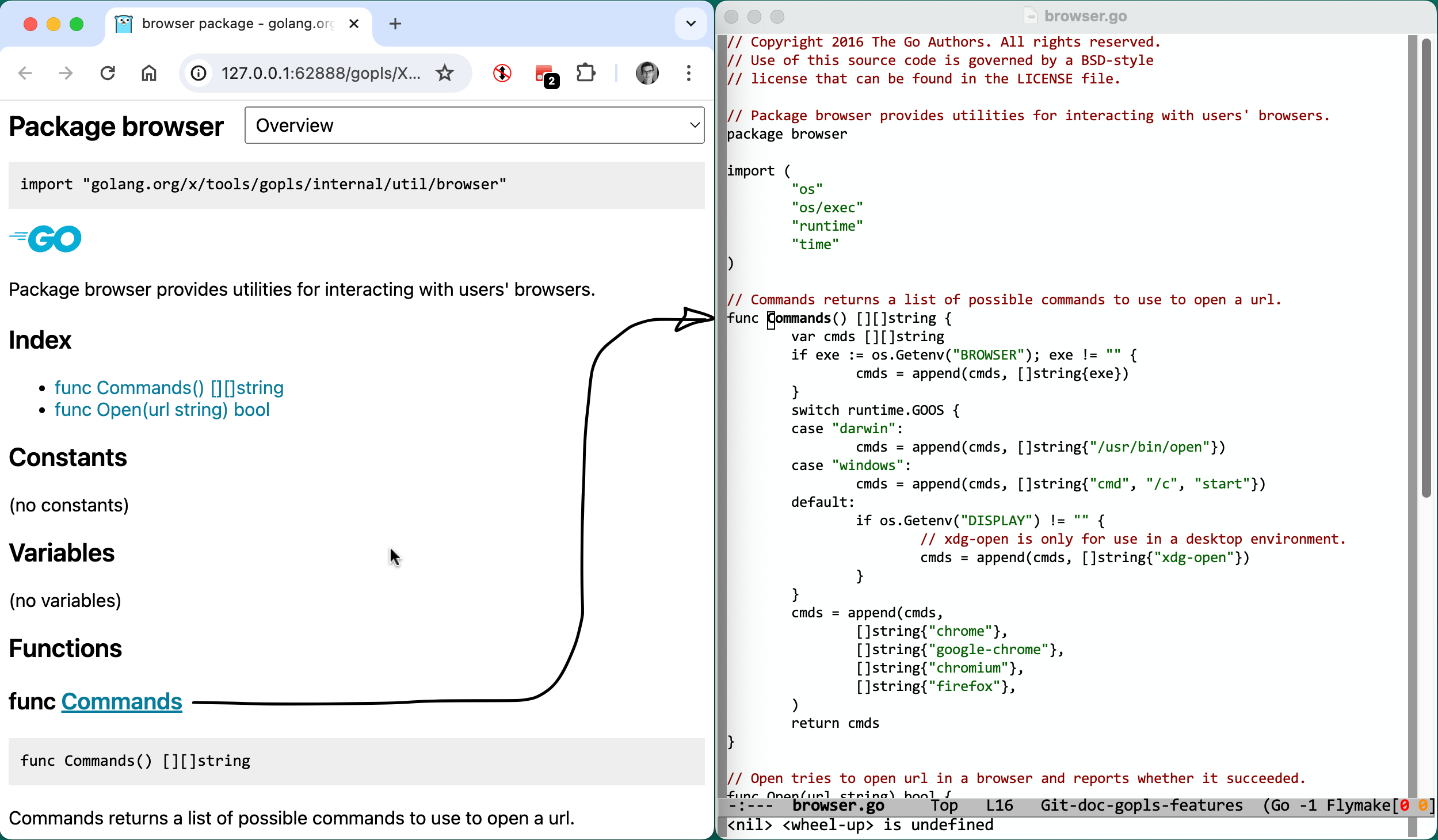 - VS Code: use the “Source action > Browse documentation for func fmt.Println” menu item. Note: source links navigate the editor but don’t yet raise the window yet. Please upvote microsoft/vscode#208093 and microsoft/vscode#207634 (temporarily closed).
