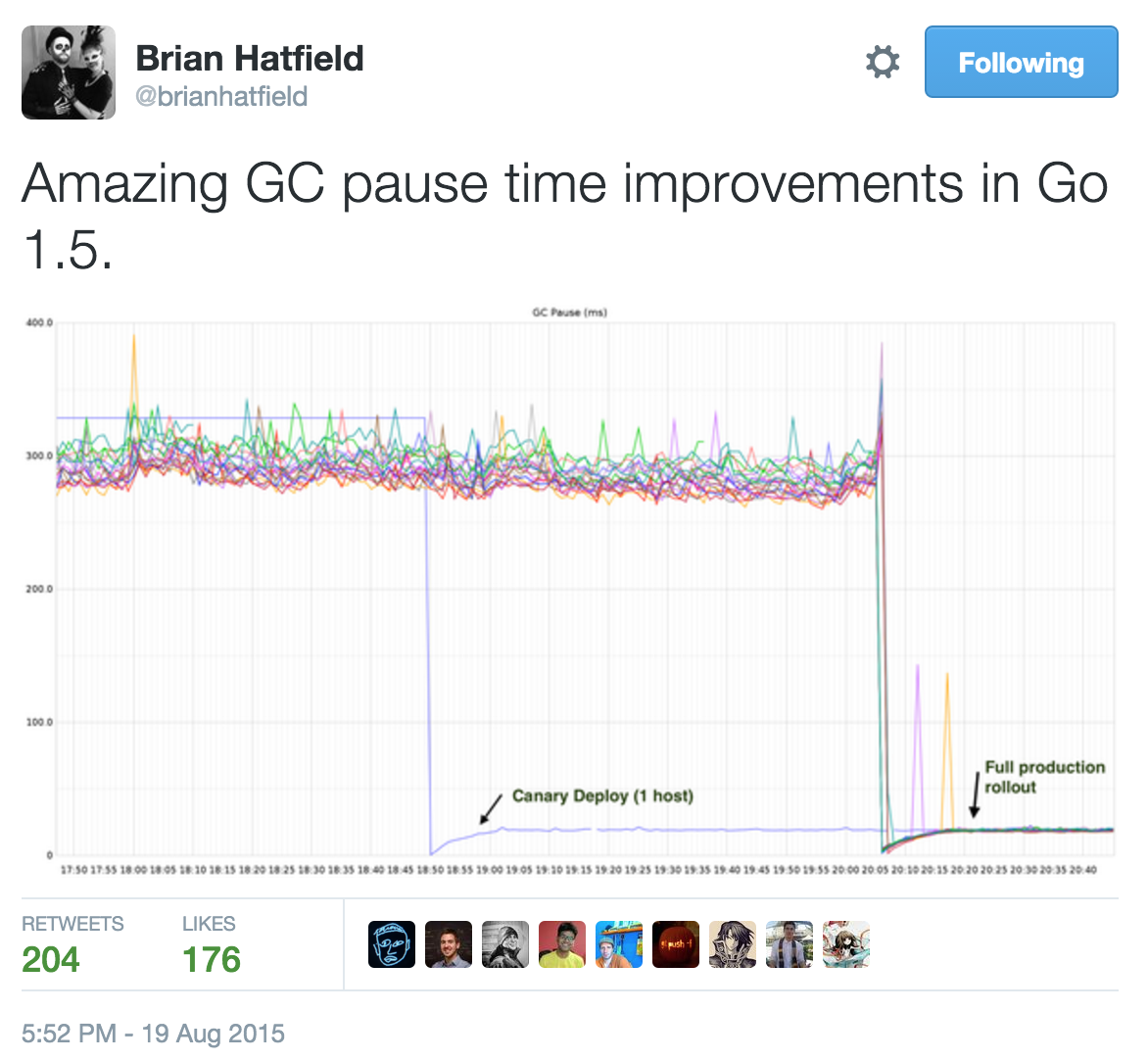 At QCon SF in November Rick Hudson gave an updated presentation which showed this comparison of Go 1.5 to the upcoming Go 1.6
